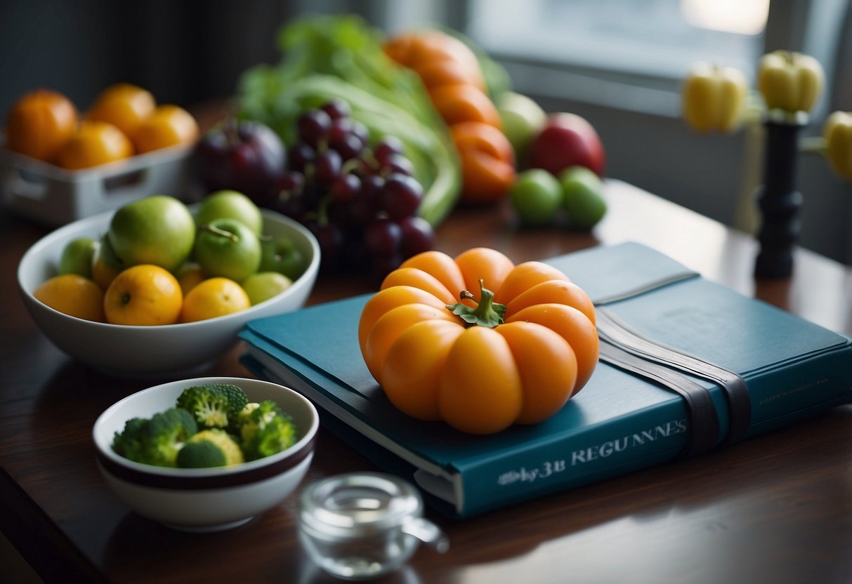 A table with balanced meals, fruits, and vegetables. A workout mat with dumbbells and resistance bands. Textbooks on nutrition and diet